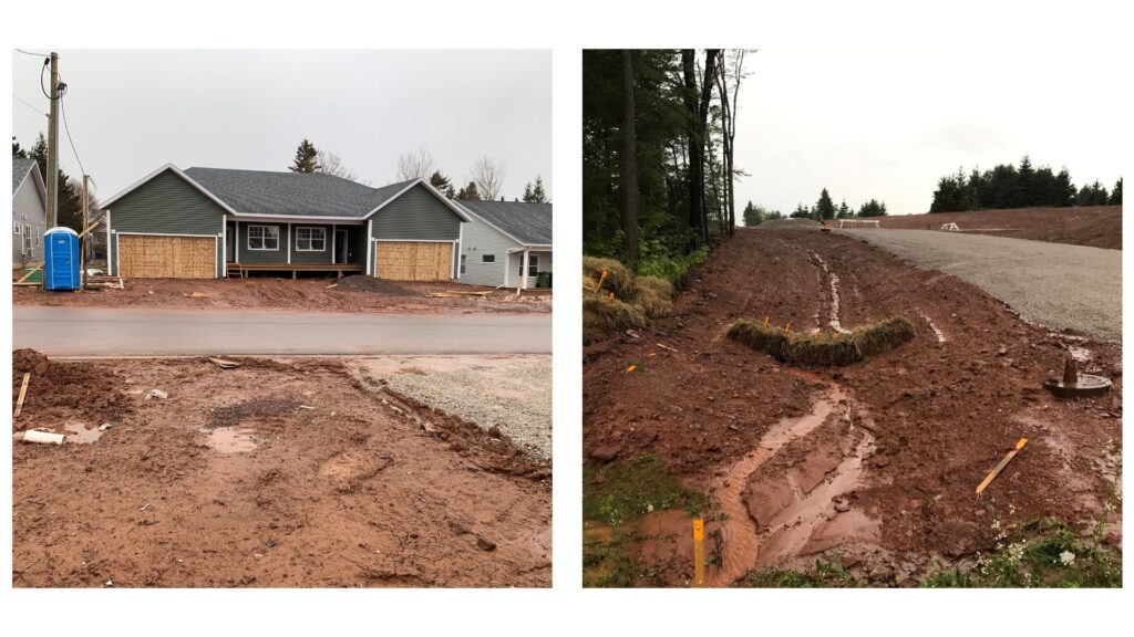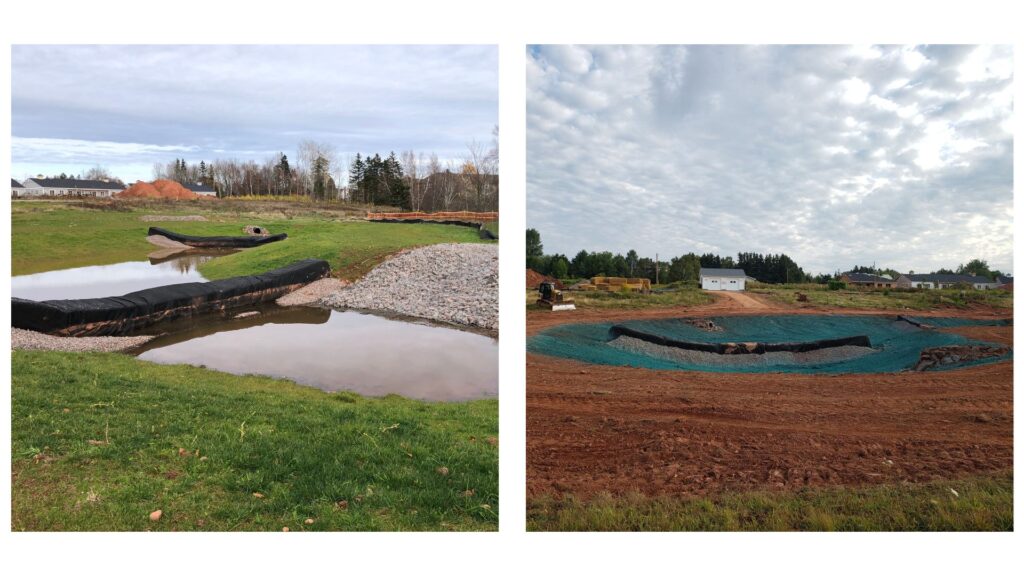 Erosion and sediment on PEIControlling erosion of sediment from development sites is an ongoing issue across Prince Edward Island (PEI). The fine particulate nature of PEI’s soil makes it particularly susceptible to erosion. Sediment is defined as a contaminant in the Environmental Protection Act (EPA) (Environmental Protection Act, 2022, Section 1, Part B).What are the negative impacts of erosion and sediment?When sediment enters a watercourse or waterbody in high concentrations it causes negative impacts, including smothering benthic organisms, reducing egg-laying habitat, blocking sunlight from aquatic plants, excessive nutrient loading, damage to fish gills, reducing visibility in water, reducing water quality, and creating costly restoration projects for future generations. Our project to rehabilitate the Pondside watershed system is a direct result of several years’ worth of heavy sedimentation from upstream development sites entering and settling in the system.Controlling erosion and sedimentThe Town of Stratford, in partnership with the Stratford Area Watershed Improvement Group (SAWIG), have created a set of guidelines (.pdf) that developers and contractors should follow, which lays out best practices for control structures and methods and explains the current regulatory environment relating to sediment and erosion control. We have also created a brochure (.pdf) to act as a quick reference guide for contractors and construction workers to follow best practices on site.Types of projectsThere are two types of projects, with different requirements depending on size and proximity to critical areas. A critical area refers to all areas that can be negatively impacted by sedimentation, including but not limited to existing developments, public roadways, watercourses and other natural ecosystems and habitats.