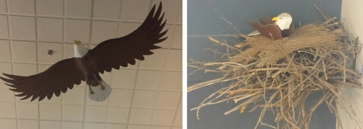 Description: This work was created using cardboard and paper individually pieced to create the feathers. The Eagles are life size and leave you in awe of their majestic size. The Bald Eagle (Kitpu/Gitpoo) is one of the most important and sacred animals for Mi’kmaq people, and many other Indigenous nations in North America. The Eagle symbolizes the messenger who carries our prayers to the Creator, because they fly highest in the sky.