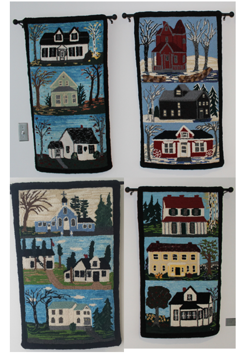 STRATFORD HERITAGE HOMES (2012)Artist/Designer: Florence ClerouxLocation: Stratford Town Centre (hallway between the recreation centre and front foyer)Description: The hand-dyed wool hooked rugs depict Stratford’s Heritage Homes. The artist carefully researched and hand-dyed each colour to match the original exterior of each heritage home