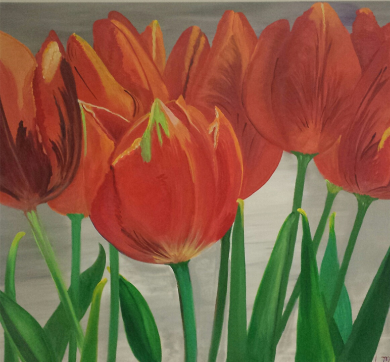 SPRING TULIPS (2024)Artist/Designer: Leona MacIntoshLocation: Stratford Town Centre (front foyer hallway outside the interior entrance to the School Board)Description: Acrylic on canvas – the artist was inspired by these beautiful spring flowers emerging after a long winter