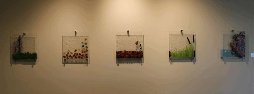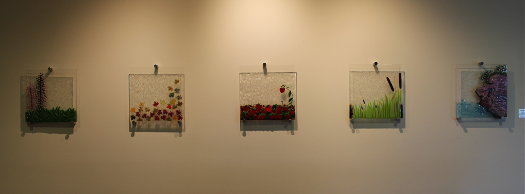 STRATFORD ELEMENTS (2006)Artist/Designer: Marcela RosembergLocation: On loan to the Stratford Public Library (25, Hopeton Road)Description: Fused glass depicting iconic symbols of Stratford, Prince Edward Island.