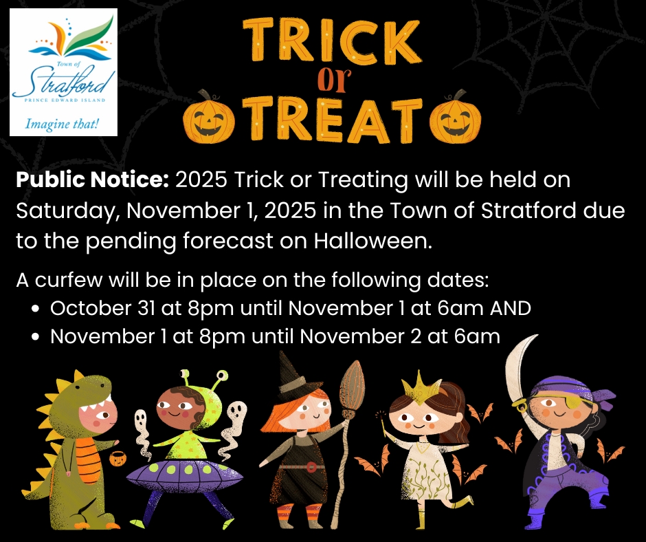 The City of Charlottetown and Towns of Cornwall and Stratford are advising residents that, due to a special weather statement forecasting heavy rain and strong winds on Friday, Halloween trick-or-treating will be postponed to Saturday, November 1.