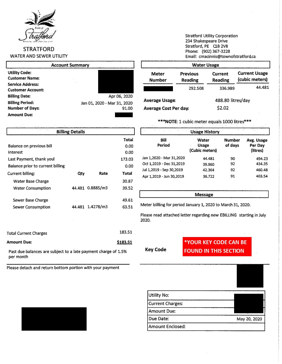 • Mail a cheque to: Stratford Utility, 234 Shakespeare Drive, Stratford, PE  C1B 2V8